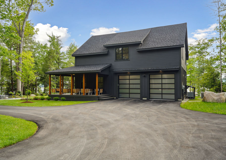 This New Hampshire home showcases a new construction encompassing both a main house and a guest house. The new main house's first floor is fairly open concept. Living, dining, kitchen, entry vestibule, and a powder room. There is also a screened porch. On the second floor, there is a primary bedroom, bathroom, and closet suite, a second bedroom, a full bathroom, and a small laundry room. The two bedrooms are connected by a catwalk that passes by a huge wall of glass windows and doors overlooking the lake.